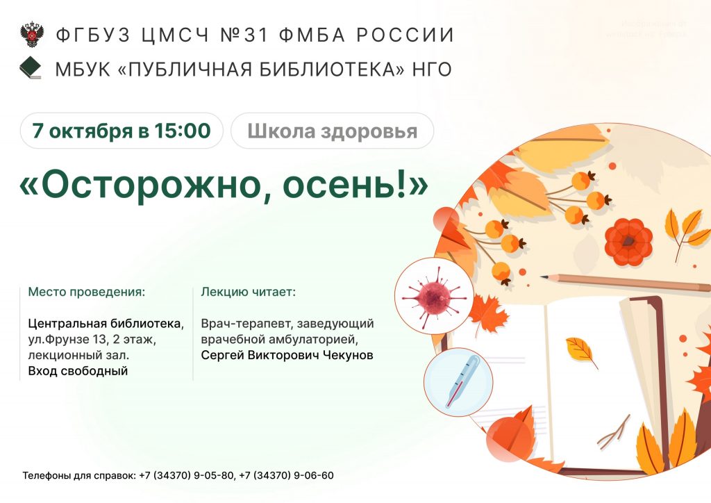 Ждем всех, кто хочет научиться заботиться о своем здоровье в холодное время года, 7 октября в 15:00 в лекционном зале городской библиотеки (ул. Фрунзе 13, 2 этаж).