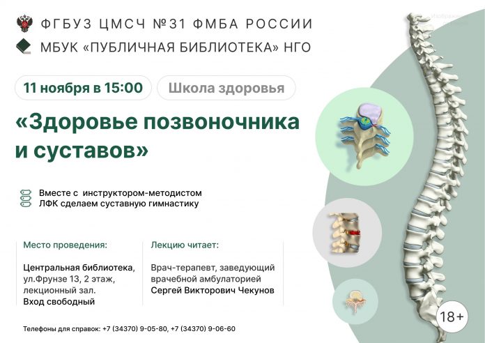 ⚕️ На занятии «Школы здоровья» Сергей Викторович Чекунов, врач-терапевт ФГБУЗ ЦМСЧ № 31 ФМБА России, расскажет о том, как сохранить здоровье опорно-двигательного аппарата, уменьшить проявления уже имеющихся заболеваний позвоночника и суставов.