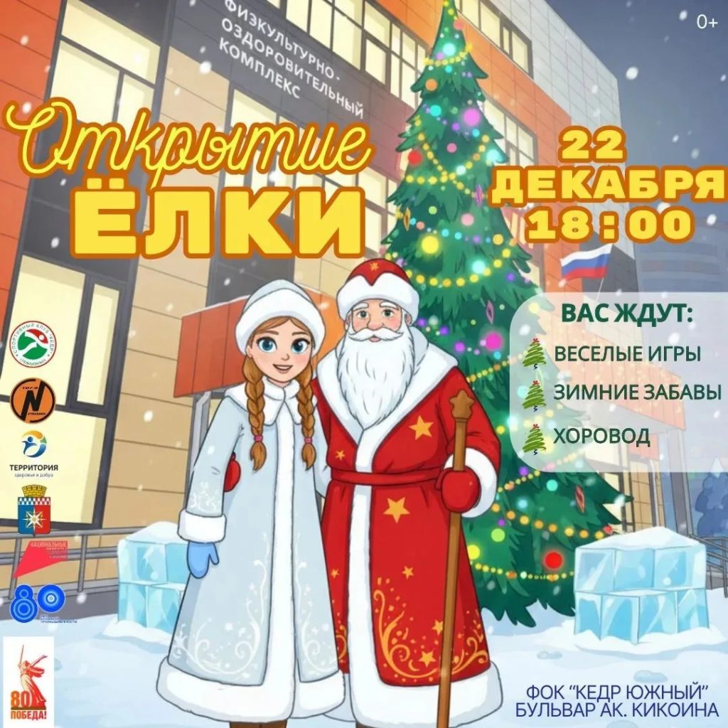В понедельник, 22 декабря, в 18:00 на площадке возле ФОК «Кедр Южный» начнется настоящее зимнее чудо – елка зажжется яркими огнями и подарит всем гостям атмосферу новогоднего волшебства.