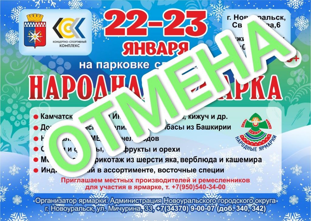 В связи с предупреждением ГУ МЧС России по Свердловской области об аномально холодной погоде на Среднем Урале, ярмарка, запланированная на 22–23 января на территории МАУ “КСК” НГО, отменяется‼