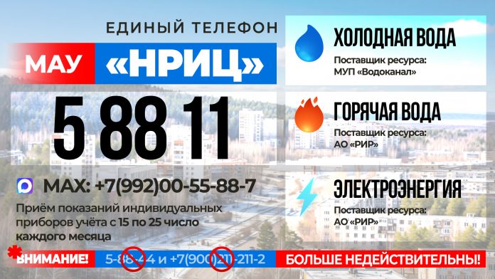С марта 2026 года прекратили свою работу телефоны для приема показаний индивидуальных приборов учета АНО «Городской центр ресурсосбережения и энергоэффективности» 5-88-44 и +7(900)211-211-2 (мессенджеры МАХ и Телеграм) – в связи с истечением срока действия договоров на оказание данных услуг между ресурсоснабжающими организациями (МУП «Водоканал», АО «РИР») и АНО «ГЦРЭ».