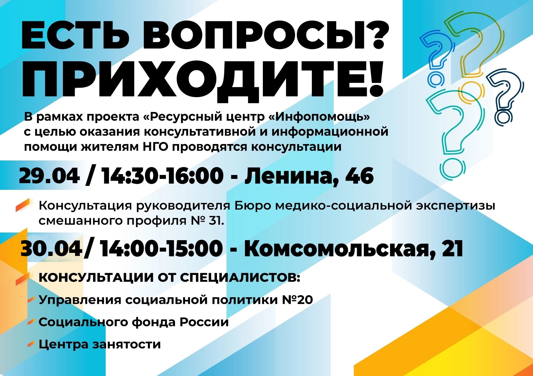В ближайшие дни, 29 и 30 апреля, для вас будут организованы консультации в рамках проекта «Ресурсный центр «Инфопомощь».